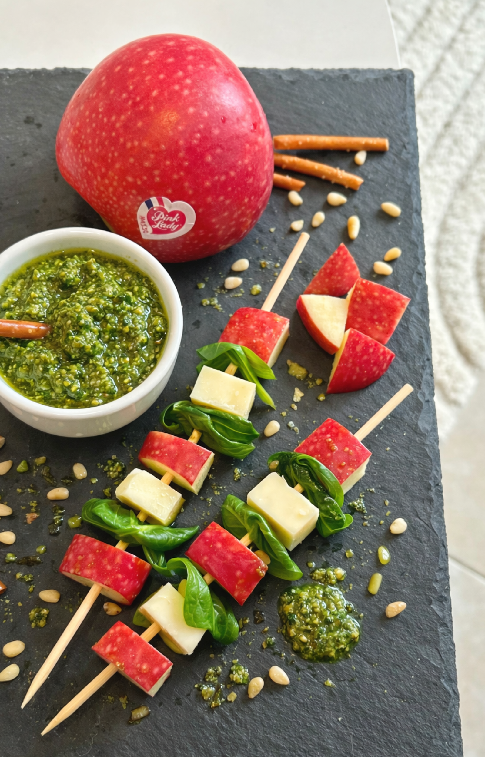 - Enfin, servez vos brochettes de pommes Pink Lady® avec une sauce au pesto vert, maison ou du commerce.