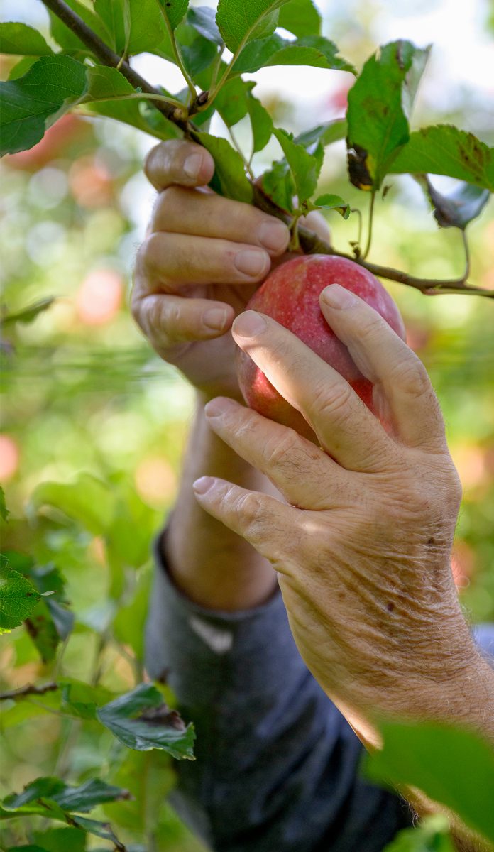 Ogni mela viene delicatamente presa nel palmo della mano, poi inclinata verso l’alto prima di staccarla, in modo da non danneggiarla. La mela viene poi staccata dal ramo con il suo peduncolo, e viene delicatamente deposta in apposite cassette. Questo gesto tradizionale viene insegnato a tutti i raccoglitori.